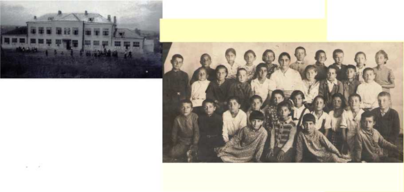 Если внимательно посмотреть на фотографию школы №1, то увидим, что со стороны улицы Ленина тоже есть вход, именно в эту дверь ходили смотреть фильмы в годы войны (так как нардом был разбомблен), а со двора школы был вход в госпиталь. А мы вернемся в 1938-ой год, когда 1 сентября дали первый звонок и для тех, кто пришел в первый класс, и для всей школы, которая впервые начала свои занятия в новом здании.