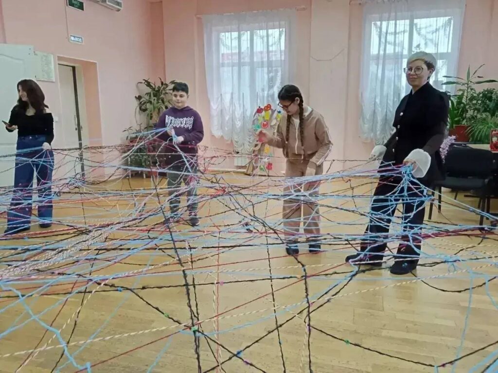 Далее состоялся шерстяной тимбилдинг. Яркие шерстяные клубки разных цветов дети и родители перекидывали друг другу, создавая Ковер дружбы — символ единства и поддержки. Эта игра была не просто развлечением, а способом сблизиться и почувствовать общность. Каждый участник «передавал» частицу себя, объединяя всех в дружное сообщество.