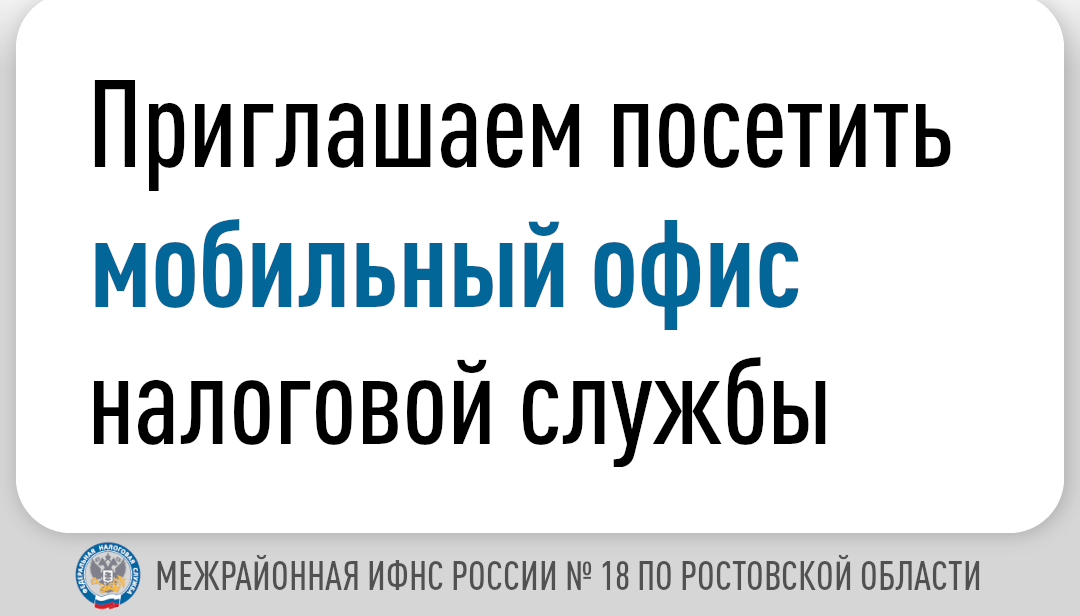 Межрайоная ИФНС №18 по Ростовской области приглашает налогоплательщиков посетить мобильный офис налоговой службы. Работа мобильного офиса будет организована с целью информирования граждан по вопросам уплаты имущественных налогов, а также НДФЛ в отношении доходов, по которым он не был удержан.