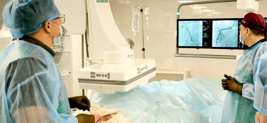 Эта процедура является длительной и высокосложной, сопряженной с рисками для жизни пациента. В РОКБ она выполняется на ангиографической системе последнего поколения, оснащенной множеством дополнительных функций, включая возможность проведения компьютерной томографии во время операции.