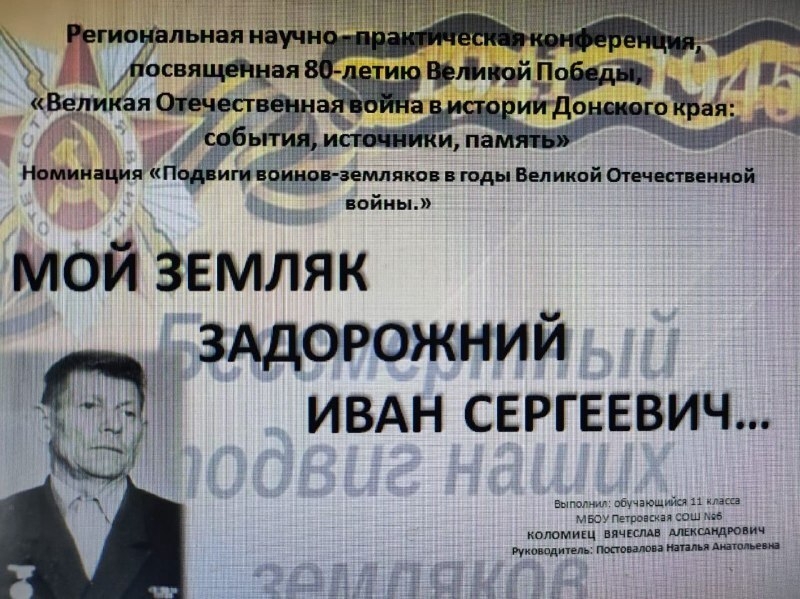 При подготовке исследования Вячеслав глубоко погрузился в изучение судьбы своего соотечественника Задорожнего Ивана Сергеевича, ветерана Великой Отечественной войны, чье жизненное наследие стало символом преданности отечеству.