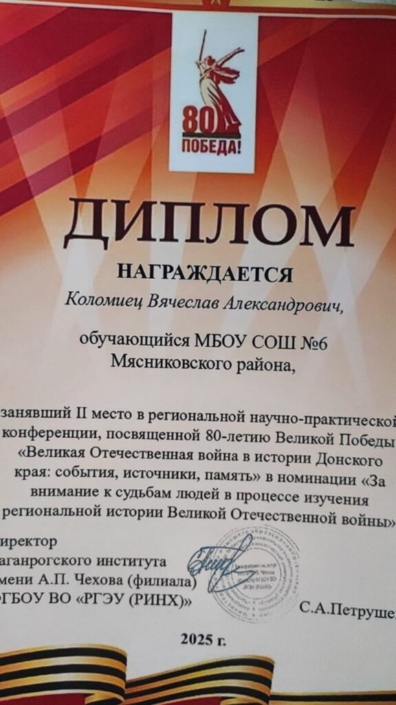Обучающийся 11-го класса Петровской школы №6 Мясниковского района Коломиец Вячеслав занял второе место на региональной конференции «Великая Отечественная война в истории Донского края: события, источники, память». Его исследовательская работа была высоко оценена членами жюри.