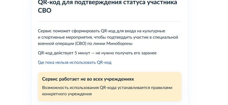 В настоящий момент сервис функционирует в пилотном режиме. В рамках данного этапа подтверждение статуса через QR-код доступно при посещении ряда государственных учреждений в сфере культуры и спорта.