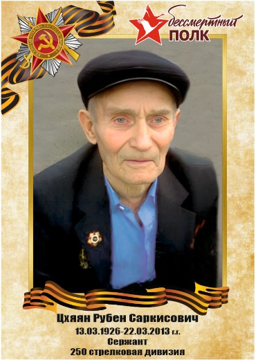 Да, войны хватило и на его долю. Рубен участвовал в освобождении белорусских городов Гродно, Могилев, Бобруйск и других. В бою он был отважным, не прятался за спины товарищей. Окончив школу младшего командного состава, получил звание сержанта. Стал командовать пулеметным расчетом. Вместе с однополчанами в 1944 году вступил на территорию Польши, в 1945-м сражался в Восточной Пруссии. Там сержант Цхяян был ранен, лечился в госпитале в городе Каунас. Снова вернулся в строй. Воевал до самой Победы.