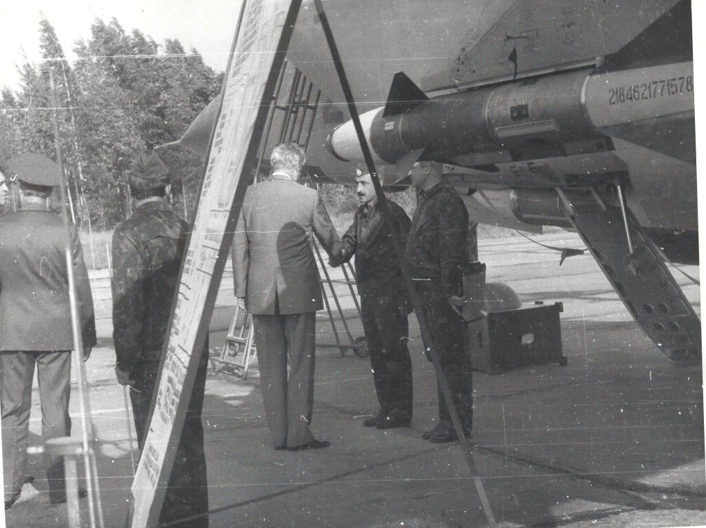 Военный летчик Кристостурян Семен Егияевич в конце 80-ых переводится на новое место службы — в военную часть под Ленинградом для дальнейшего прохождения службы в частях ПВО. Он осваивает сверхзвуковой истребитель-перехватчик МИГ -31. Прошло время. В семье нашего героя подрастают дочь и сын. За отличную службу военный летчик Кристостурян награждается государственной награ­дой. Ему присвоено очередное воинское звание. И вовсе не случайно то, что Президенту России — Верховному Главнокомандующему государства, посетившему летную часть, где служил Симон, был лично представлен летчик Кристостурян. На фото, сделанном друзьями-сослуживцами, запе­чатлен момент их памятного рукопожатия.
