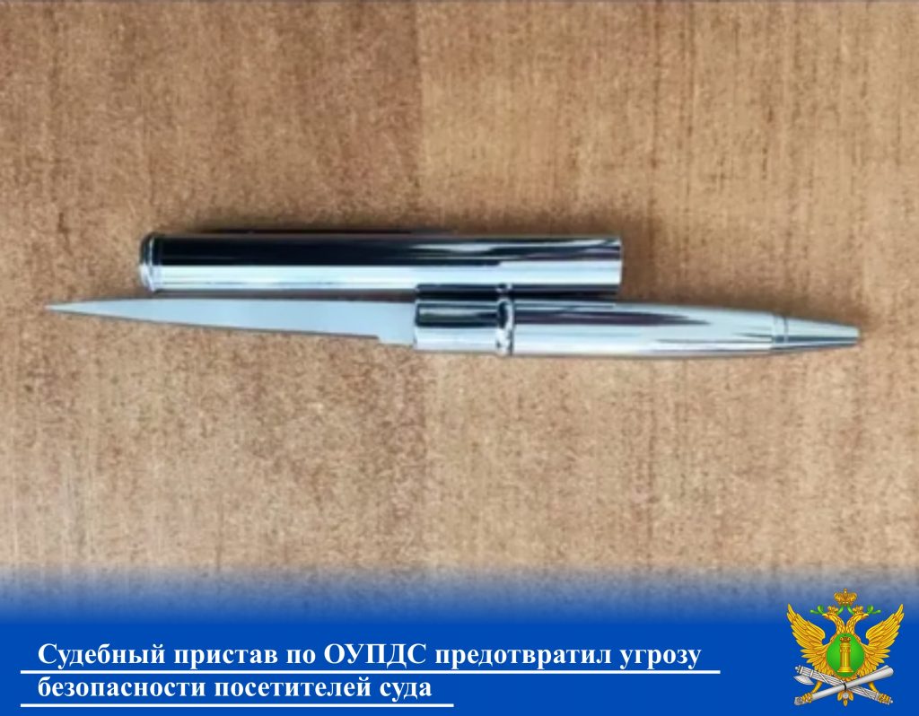 В здание Советского районного суда г.Ростова-на-Дону прибыла гражданка в качестве участника судебного заседания. В соответствии с правилами пребывания посетителей, судебный пристав по ОУПДС, осуществлявший пропускной режим, ознакомил посетительницу суда с перечнем запрещенных к проносу предметов и предложил в случаи нахождения у неё таких предметов, предъявить их в добровольном порядке. Гражданка заверила судебного пристава, что не имеет при себе запрещенных к проносу предметов. Тем не менее, при осмотре сумочки, находившейся у посетительницы суда, судебный пристав по ОУПДС обнаружил обычную металлическую ручку, но при детальном осмотре в канцелярском товаре был обнаружен встроенный колющий предмет — спрятанное под колпачком лезвие. В отношении гражданки составлен административный протокол по ч.2 ст.17.3 КоАП РФ.