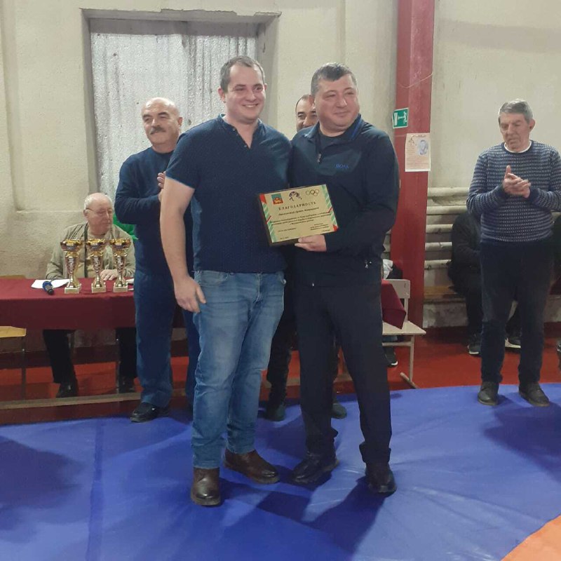 Президент Федерации греко-римской борьбы Мясниковского района Ашот Мартиросович вручил памятный планшет младшему сыну Манука Калустовича — Армену.