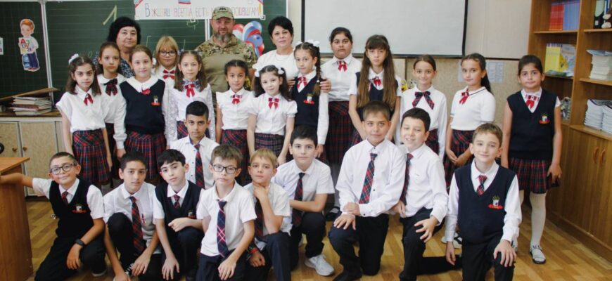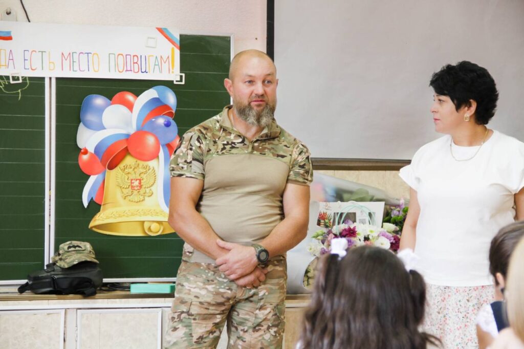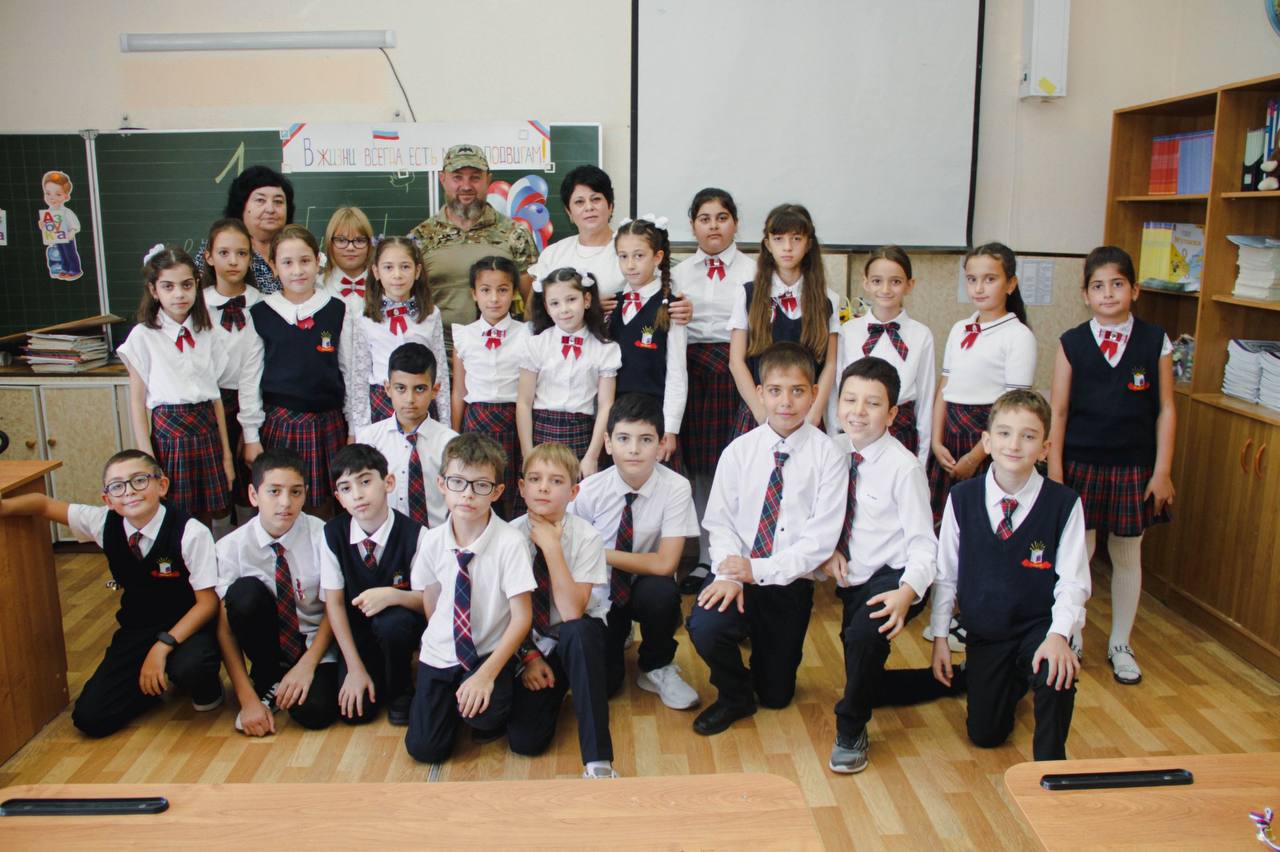 Сразу после урока мы приняли гостей — социального координатора поддержки участников СВО «Защитники Отечества» Ирину Вазгеновну Хочкиян и участника СВО Сергея Викторовича Задорожного. Дети слушали затаив дыхание его поздравление с началом учебного года и наставления о необходимости хорошо учиться, чтобы быть достойными гражданами Отечества.