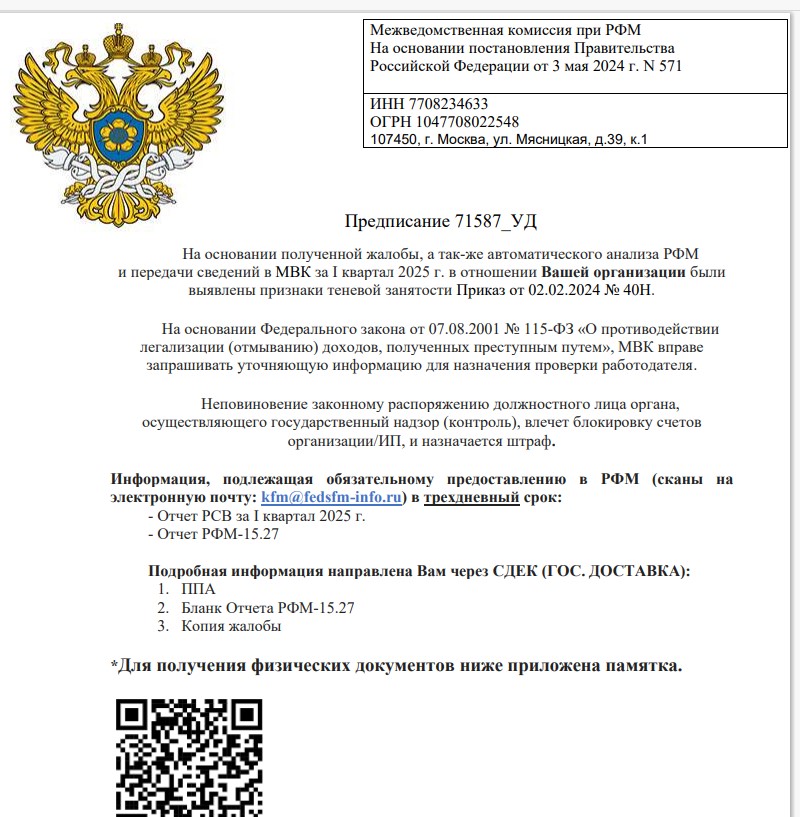 В письме утверждается: «На основании полученной жалобы и автоматического анализа РФМ, а также передачи сведений в МВК за I квартал 2025 года, в отношении вашей организации были выявлены признаки теневой занятости». Однако в сообщении отсутствуют конкретные данные: ни имя директора, ни полное наименование организации, что указывает на массовую рассылку.