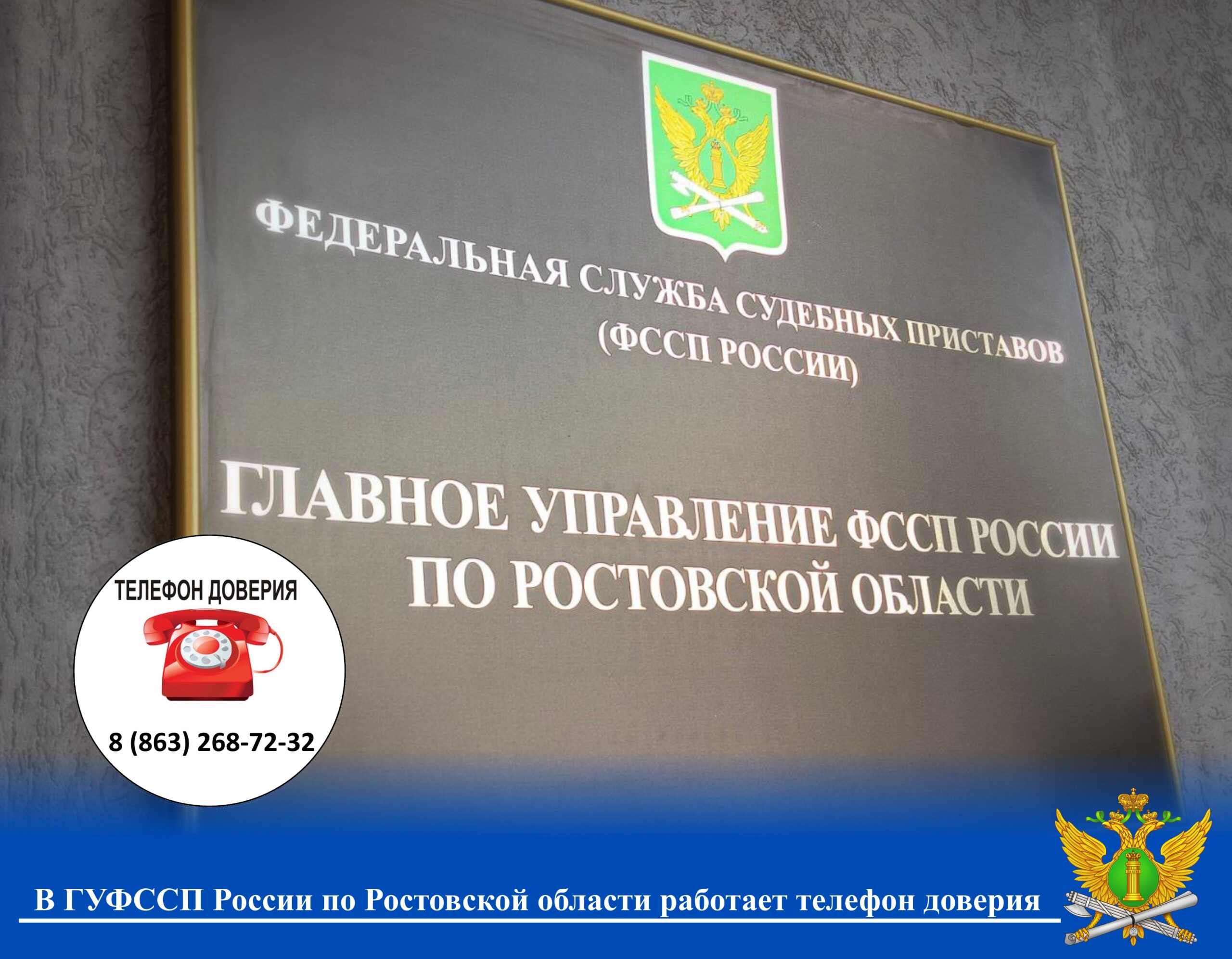Руководство Главного управления Федеральной службы судебных приставов по Ростовской области настоятельно рекомендует гражданам Ростовской области незамедлительно сообщать о каждом факте противоправных действий судебных приставов по телефону доверия» — 8 (863) 268-72-32, который работает круглосуточно.