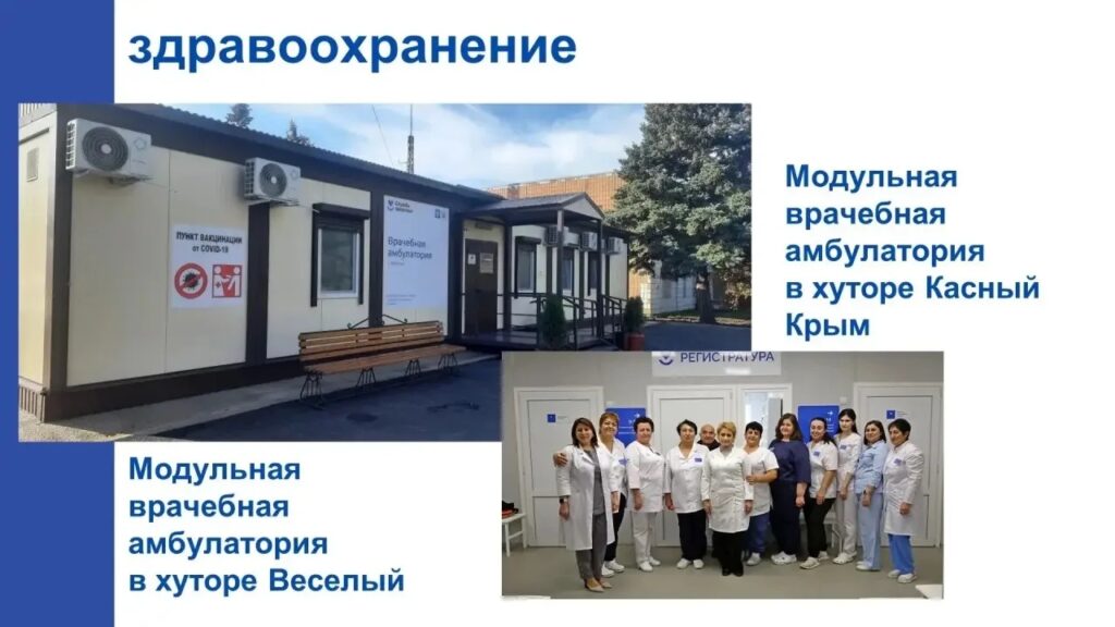 В сфере здравоохранения в Центральной районной больнице и амбулаториях сельских поселений было приобретено новое медицинское оборудование, включая компьютерный томограф. Также были открыты модульные врачебные амбулатории в хуторе Веселый и х. Красный Крым, обеспеченные всем необходимым для оказания первичной медицинской помощи.