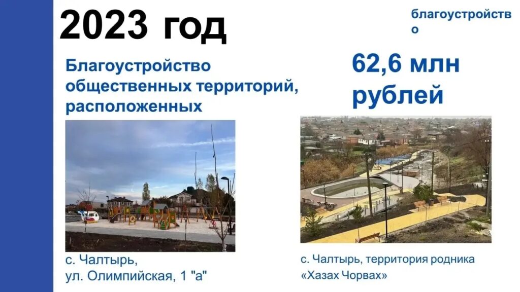 Благодаря национальному проекту «Жилье и городская среда» и реализации партийного проекта «Удобная и комфортная жизнь» были созданы новые места отдыха для жителей. В селе Чалтырь появились две благоустроенные общественные территории: парк «Олимпийский» и обновленная зона вокруг родника Хазах Чорвах.