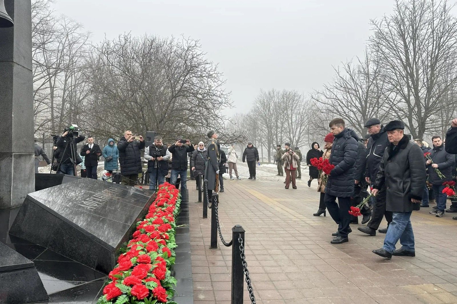 Участники мероприятия почтили память погибших минутой молчания. Военный оркестр исполнил Государственный гимн Российской Федерации, а почетный караул прошел перед памятником с торжественным маршем.