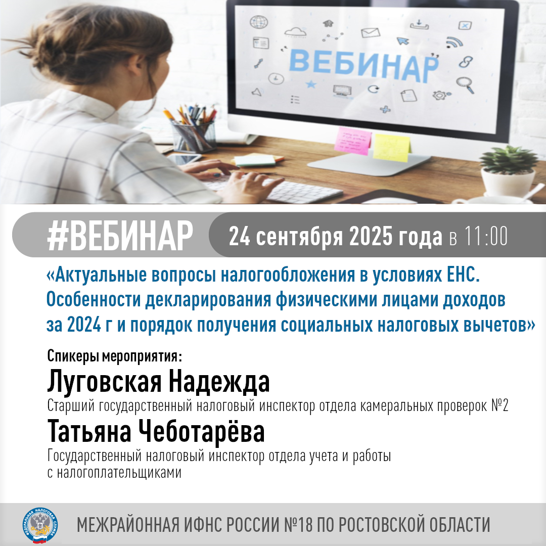 Приглашаем налогоплательщиков принять участие в вебинаре по теме «Актуальные вопросы налогообложения в условиях ЕНС. Особенности декларирования физическими лицами доходов за 2024 год. Порядок получения социальных налоговых вычетов».