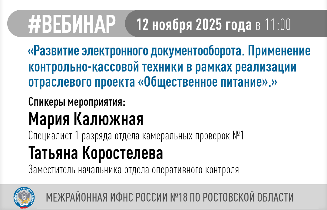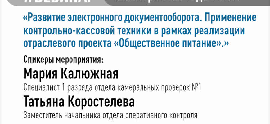 Приглашаем налогоплательщиков принять участие в вебинаре по теме «Развитие электронного документооборота. Применение контрольно-кассовой техники в рамках реализации отраслевого проекта «Общественное питание».»
