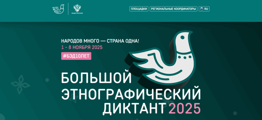 С 1 по 8 ноября 2025 года Федеральное агентство по делам национальностей совместно с партнёрами проводит X Всероссийскую просветительскую акцию «Большой этнографический диктант». Юбилейная, десятая по счёту акция направлена на укрепление общероссийской гражданской идентичности, популяризацию традиционных российских духовно-нравственных ценностей и борьбу с фальсификацией истории.